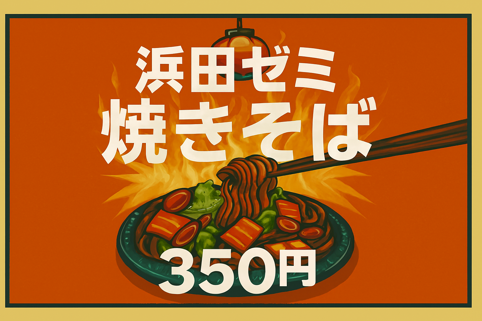 ソースと野菜、豚肉を豪快に炒め上げた自慢の焼きそば。熱々の鉄板から立ちのぼる湯気と香りは最高。多摩祭でしか味わえない特別な浜ちゃん焼きそばをどうぞ